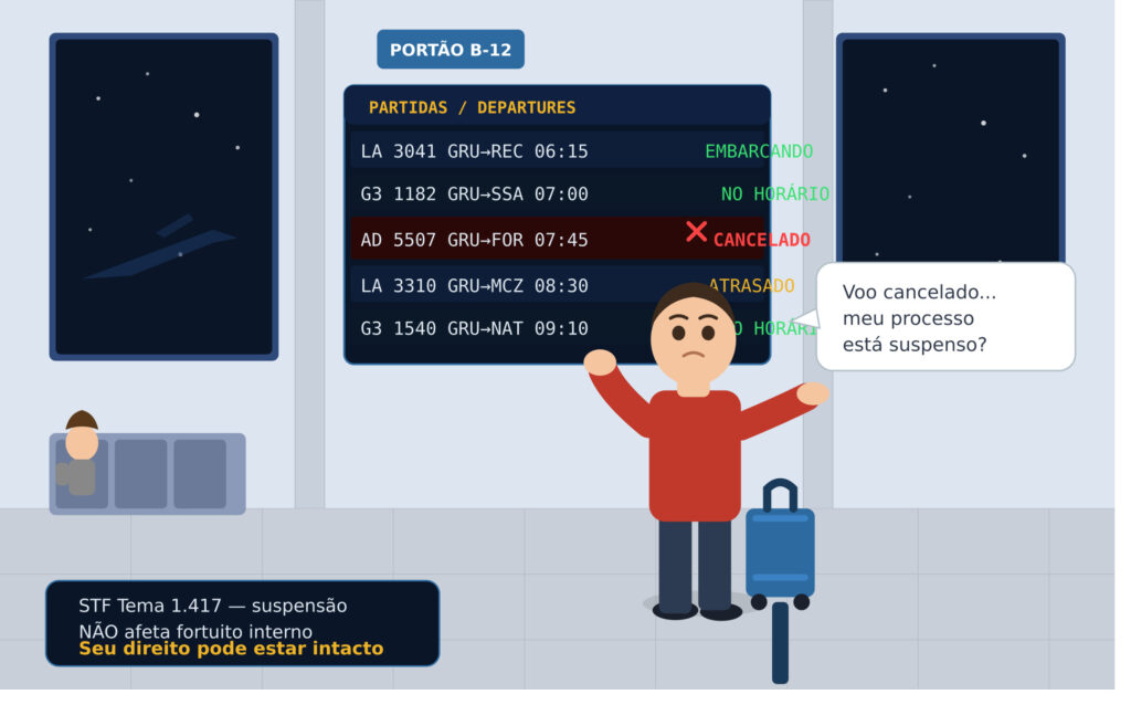 Roberto ajuizou ação. A companhia aérea, em sua defesa, invocou o Tema 1.417 do STF e pediu a suspensão do processo. O juiz analisou os autos e percebeu que a empresa não apresentou qualquer prova de evento externo — não havia registro de fechamento de aeroporto, restrição de espaço aéreo ou condição meteorológica adversa. O cancelamento decorreu de “problema operacional”, ou seja, fortuito interno.